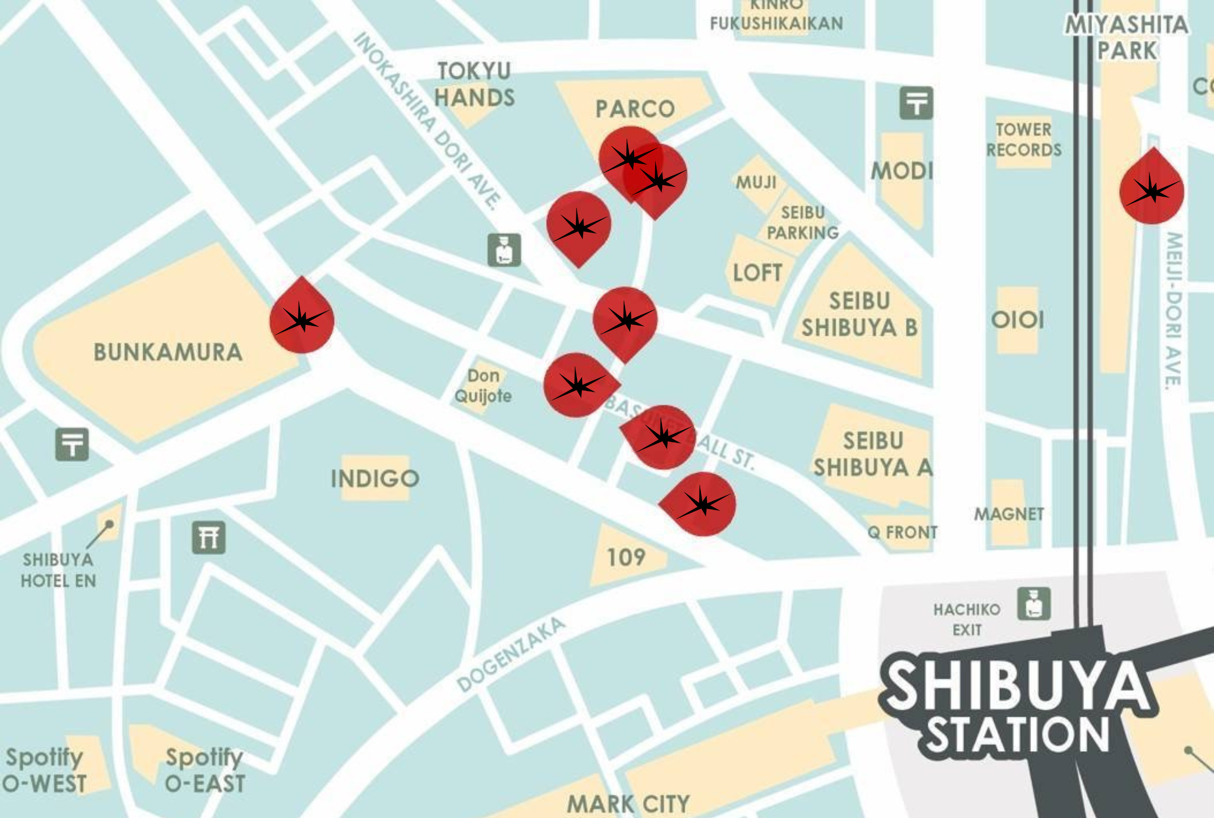 スペイン坂コーナーボード、KN渋谷2ビル、カラオケ館 渋谷本店側面、カラオケ館 渋谷本店正面、ABC-MART 裏壁面、サンルイビル、サイトービル、宮下公園ボード